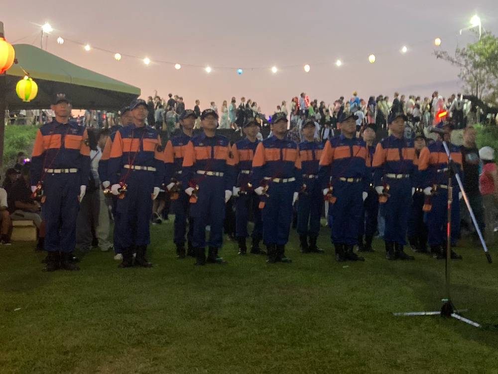 櫓の上で、南部地区各消防団の隊員達によるラッパを合図に花火がスタート。 岐阜市議会議員の方々も応援に