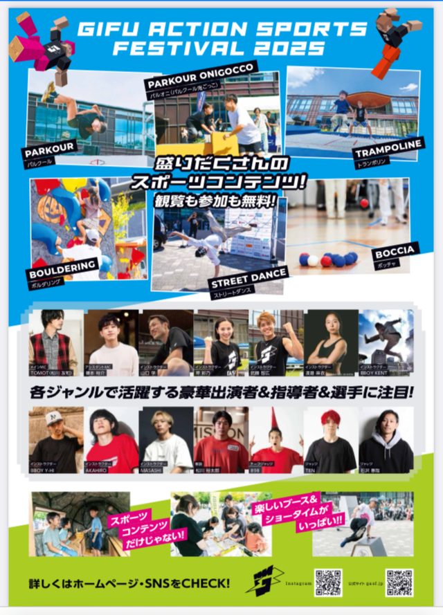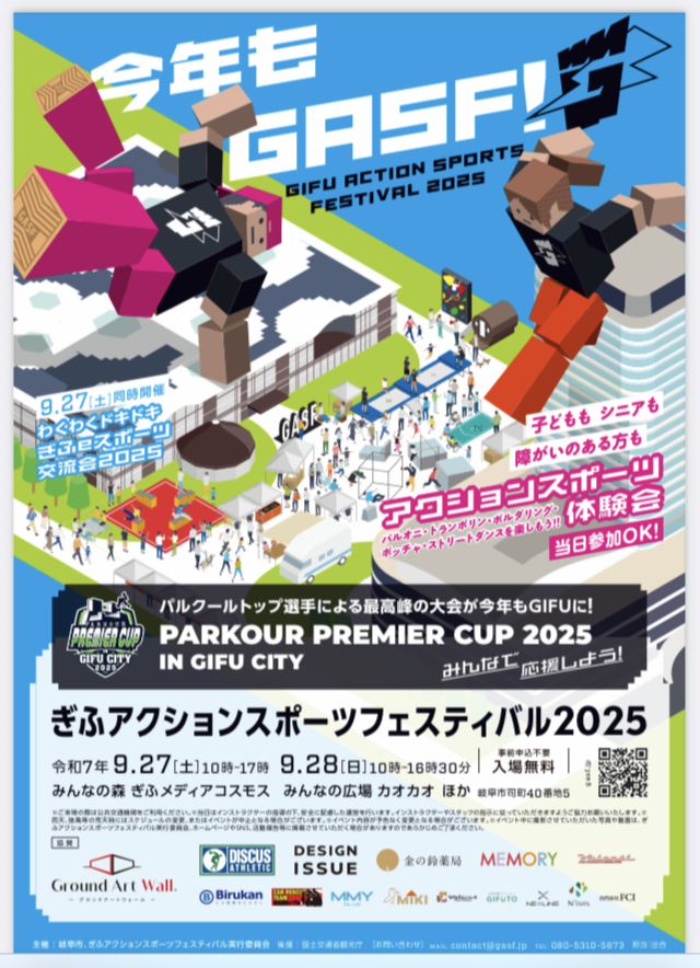 新時代のアクションスポーツGASFが、令和7年9月27日(土)28日(日) 会場は、みんなの森 ぎふメディアコスモス みんなの広場カオカオほかで開催されます。特別なスタジアムがいらない。いつもの広場が夢の舞台。まるでアクションパーク。2023・2024年と、2年連続で述べ1万人以上の来場したとの事です。2025年も開催が決定したので、有限会社イブカとして応援をして貰えないかと、相談を受けていました。弊社としても、スポーツ関連のバックアップをしている選手も居ますので、協賛をさせて頂く事になりました。プレイイベントとしてパルオニ(パルクール鬼ごっこ)体験を実施するとの事。事前申込不要、参加費無料でどなたでも気軽に参加できるそうです。時間のある方、興味のある方は参加してみてください。有限会社イブカは、スポーツ関連・選手を応援しています。