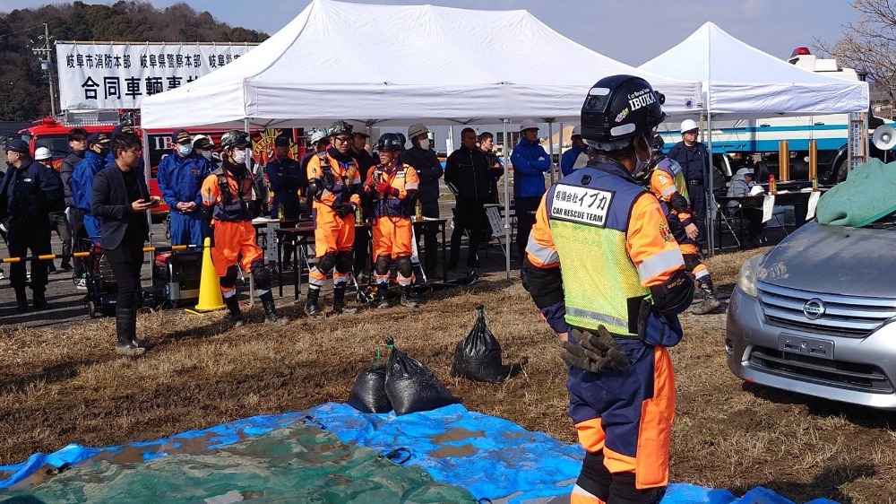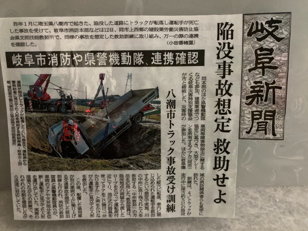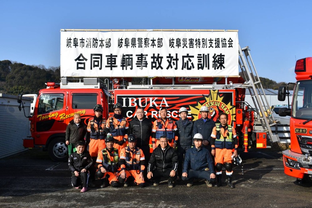 2026年2月12日に、陥没事故想定及び多重事故による救出訓練を行いました。去年1月に埼玉県八潮市で起きた、陥没した道路にトラックが転落し運転手の方が死亡した事故を受け、この度陥没事故想定訓練・多重事故救助訓練を行う事となりました。近年、災害や事故は発生場所や状況を問わず突発的に起こり得るものとなっております。そのような状況に的確に対応する為には、各機関がそれぞれの役割を果たすだけではなく、平時から顔の見える関係を築き、実践的な連携を深めておくことが、極めて重要であります。今回訓練に参加して頂いたのは、岐阜市・岐阜市消防本部・岐阜県警察本部・岐阜災害特別支援協会の方々60名程。他、岐阜圏域の消防関係者50名程も見学にお見えになっていました。岐阜市消防本部が主体で行った陥没事故想定の訓練を、岐阜市・岐阜県警察本部の方々が真剣な眼差しで見学をしていました。次に、多重事故による車内に閉じ込められた人の救助訓練になります。この訓練は、転覆した車両は、岐阜市消防本部が対応。転覆した車両の下にもう一台有こちらの方は、岐阜県警察本部が対応。車両が積み重なっている為に、消防と警察の連携で車両の引き離し作業を行いました。引き離し完了後、閉じ込められた人の救助活動となりました。実際の現場さながらの訓練となり、救助活動を通して、顔の見える関係を築き災害・事故が起こった際には、関係機関の連携が出来る事だと思っています。当社からは、大型レッカー車等で参加致しました。。昨年12月に、岐阜市と車両等障害物除去に関する協定に基づき、岐阜災害特別支援協会としての参加となります。最近でも、道路陥没のニュースもありました。水道管の老朽化が進み道路陥没は、いつ、どこで起こるか分かりません。事故に至っては、日常的に起こり怪我や亡くなる方も少なくはありません。少しでも助かる命を助ける為に、今回の訓練が役に立てばと思っています。最後に、この訓練に参加された岐阜市・岐阜市消防本部・岐阜県警察本部・岐阜災害特別支援協会(㈱ビルカン・㈱エススタイル)この訓練を通して今後の連携強化が出来ると思います。有限会社イブカとして、今回の訓練を通じ関係機関との連携強化が出来た事。そして実際の現場での連携を出来る事を認識いたしまいた。
